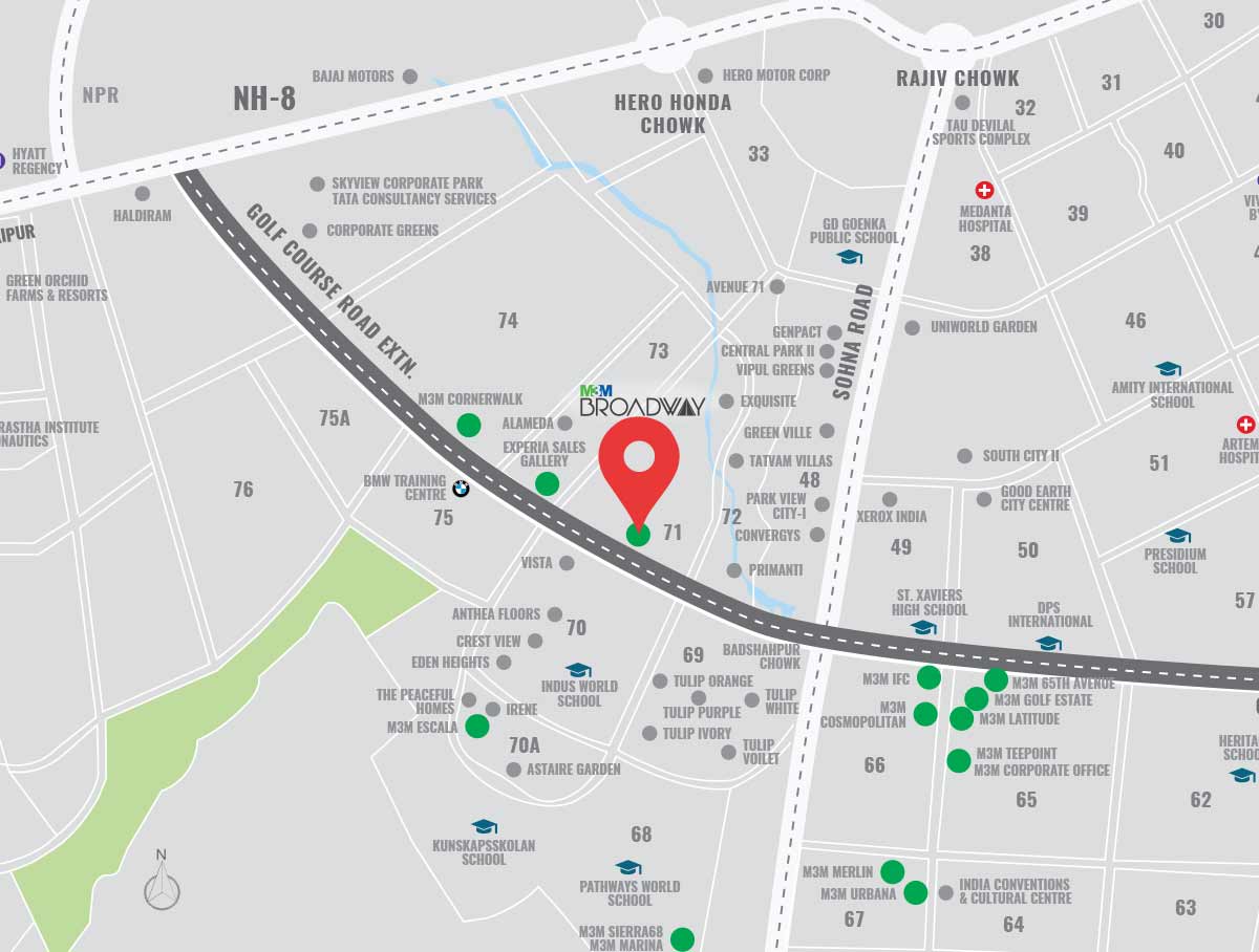 When it comes to the perfect location of M3M Broadway, it enjoys seamless connectivity with 3 major roads: Sohna Road, NH-8, and Golf Course Road Extn. This ease in connectivity is bound to usher in a large footfall. There are plenty of high-end residential projects being developed in close vicinity that are expected to substantially increase the total catchment population in the next 3 years.